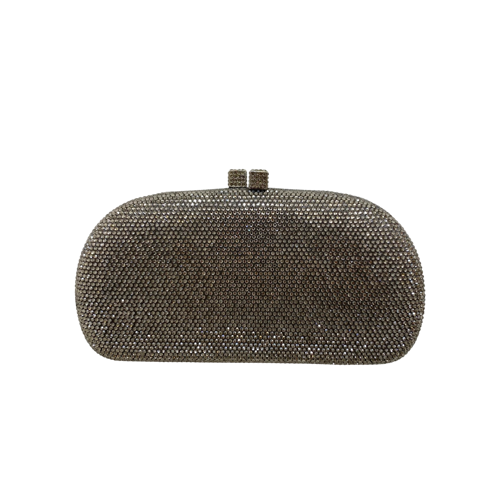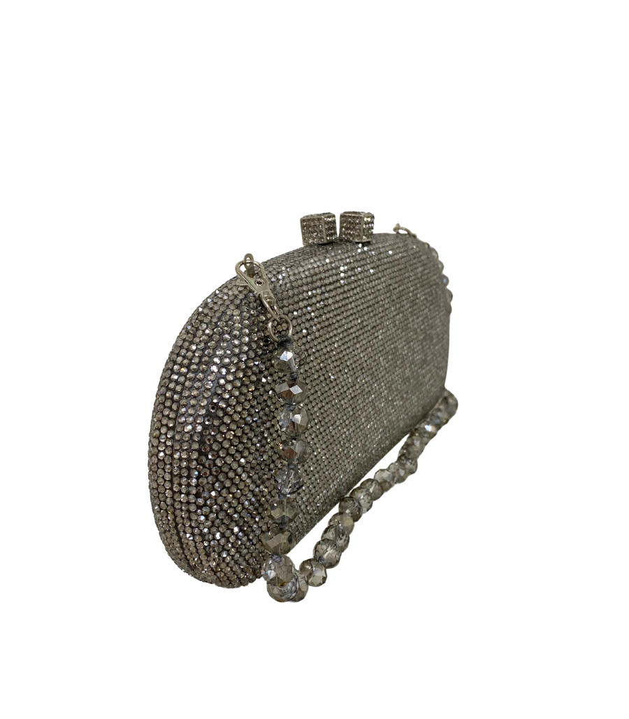 Clutch Anne Black Diamond em cetim grafite com cristais aplicados no mesmo tom. Fechamento magnético por encaixe. Acompanha duas alças removíveis: uma em cristais e uma em corrente de metal