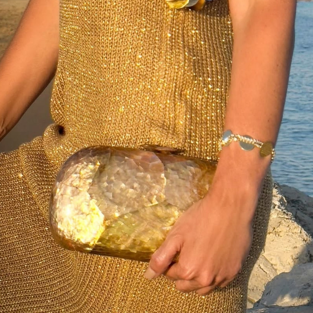 Clutch oval em madrepérola marrom furtacor. Forro em veludo. Fechamento magnético com encaixe. Design estruturado.