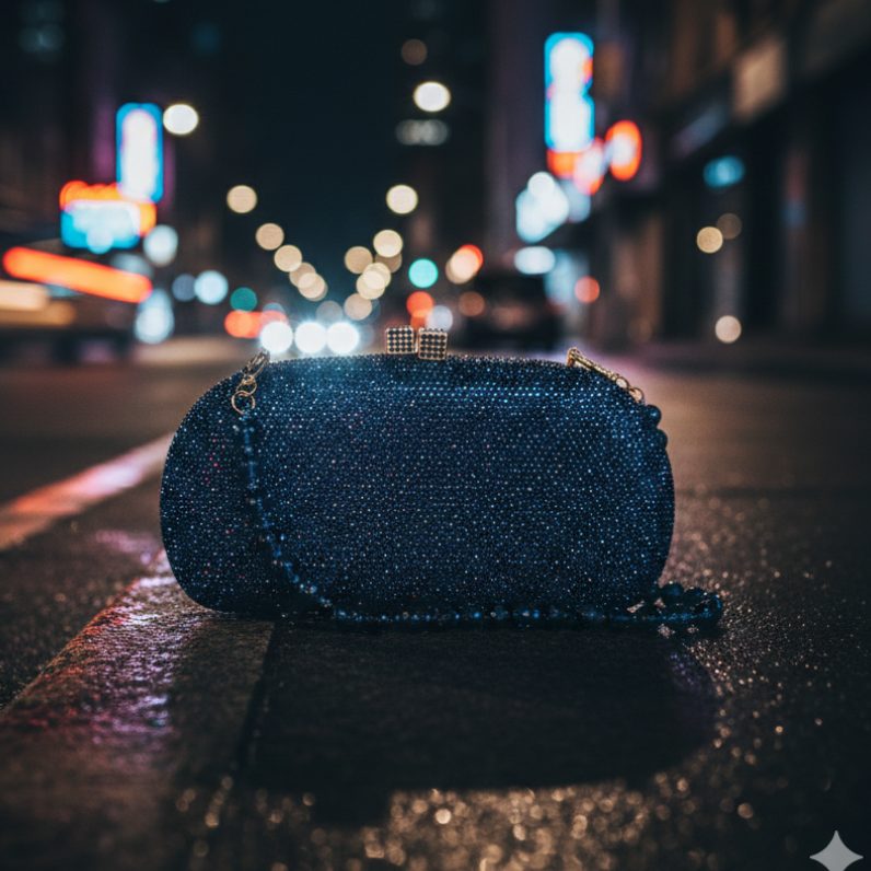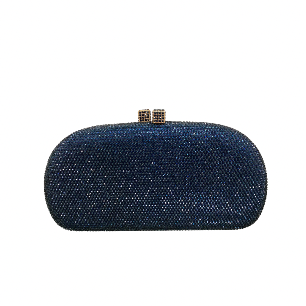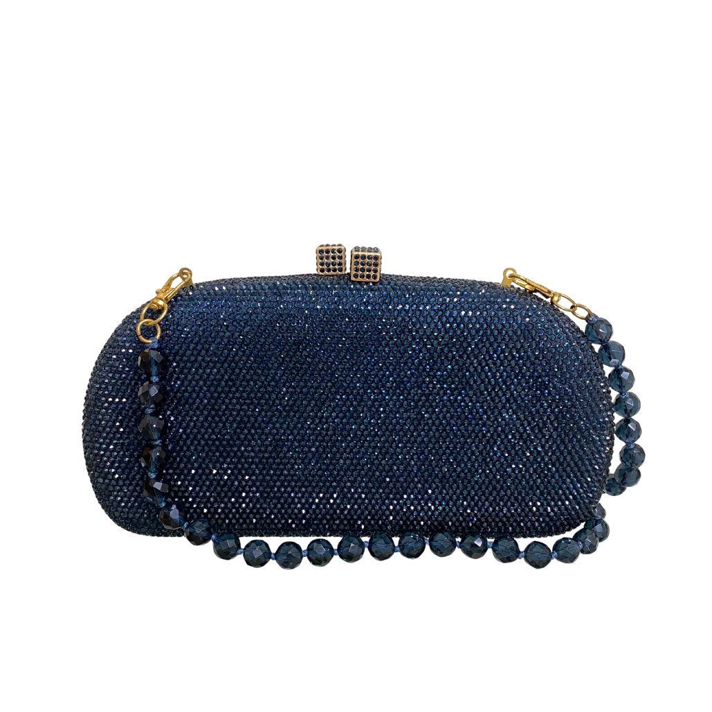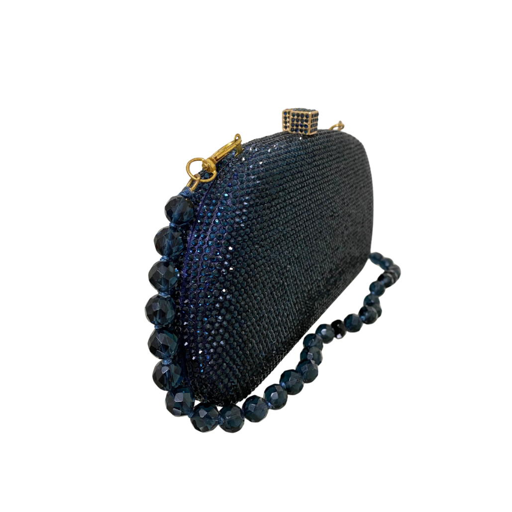 Clutch Anne Montana com fechamento magnético por encaixe. Acompanha duas alças removíveis, uma em corrente de metal e uma alça de cristal