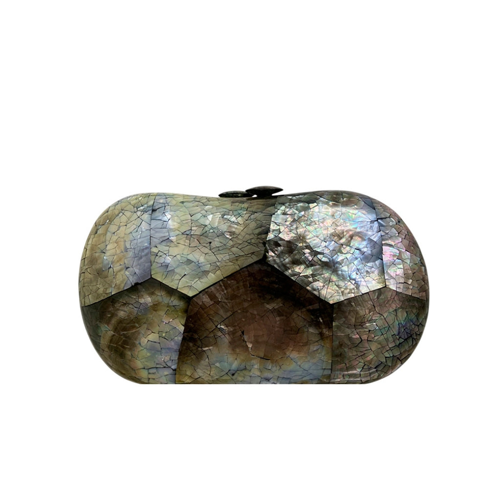 Clutch Bean Blacklip em madrepérola Black Lip natural, composta por placas facetadas que criam um mosaico iridescente com variações orgânicas de cor. Estrutura rígida com acabamento artesanal meticuloso, garantindo brilho profundo e textura singular. Fecho superior no mesmo material, discreto e elegante. Interior com forro em veludo.