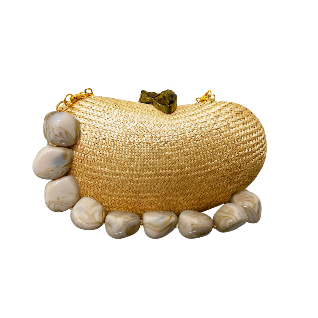 Clutch em formato orgânico Bean Toast de palha bege. Forro em poliéster. Fechamento magnético por encaixe com detalhe de pedra natural. Acompanha duas alças removíveis: uma de pedras brasileiras e outra de corrente de metal.