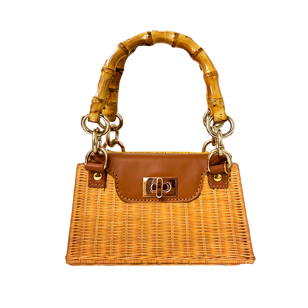 Beatrice Light Honey de vime natural com trama fechada e detalhe de couro caramelo. Forro em poliéster. Fechamento magnético. Alça fixa de bambu e alça removível de couro caramelo.