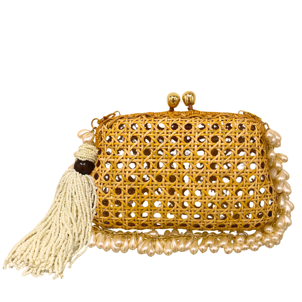 Clutch Blair Light Honey de vime com trama aberta. Forro em vinil transparente. Fechamento magnético por encaixe. Acompanha duas alças removíveis: uma de couro caramelo e outra de pedras brasileiras. Detalhe de tassel de miçangas.