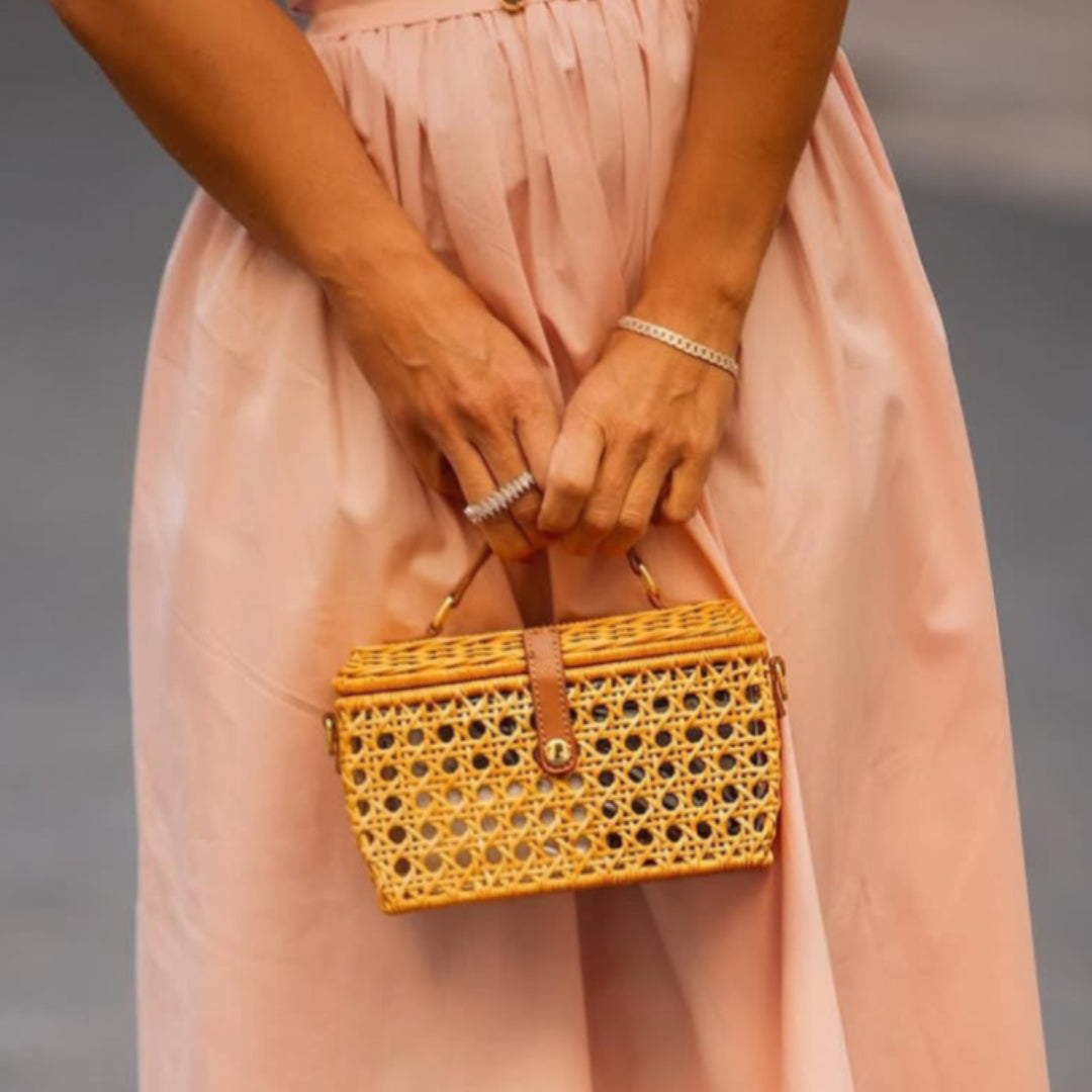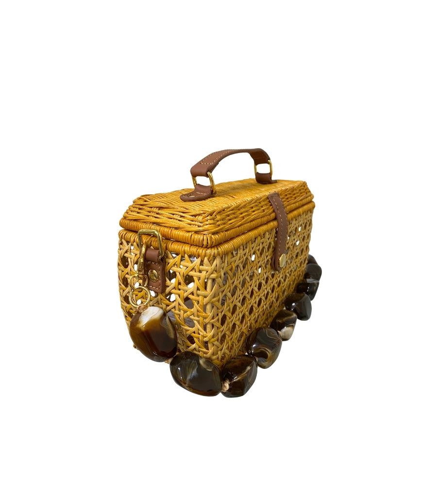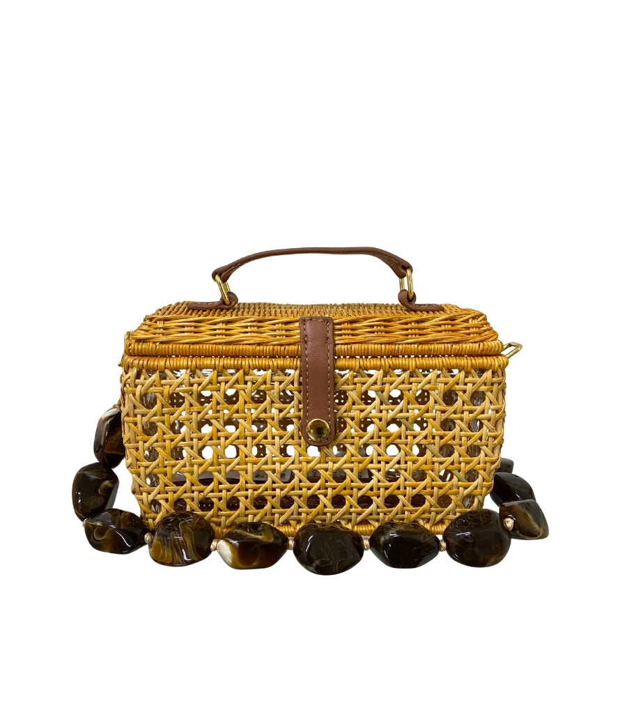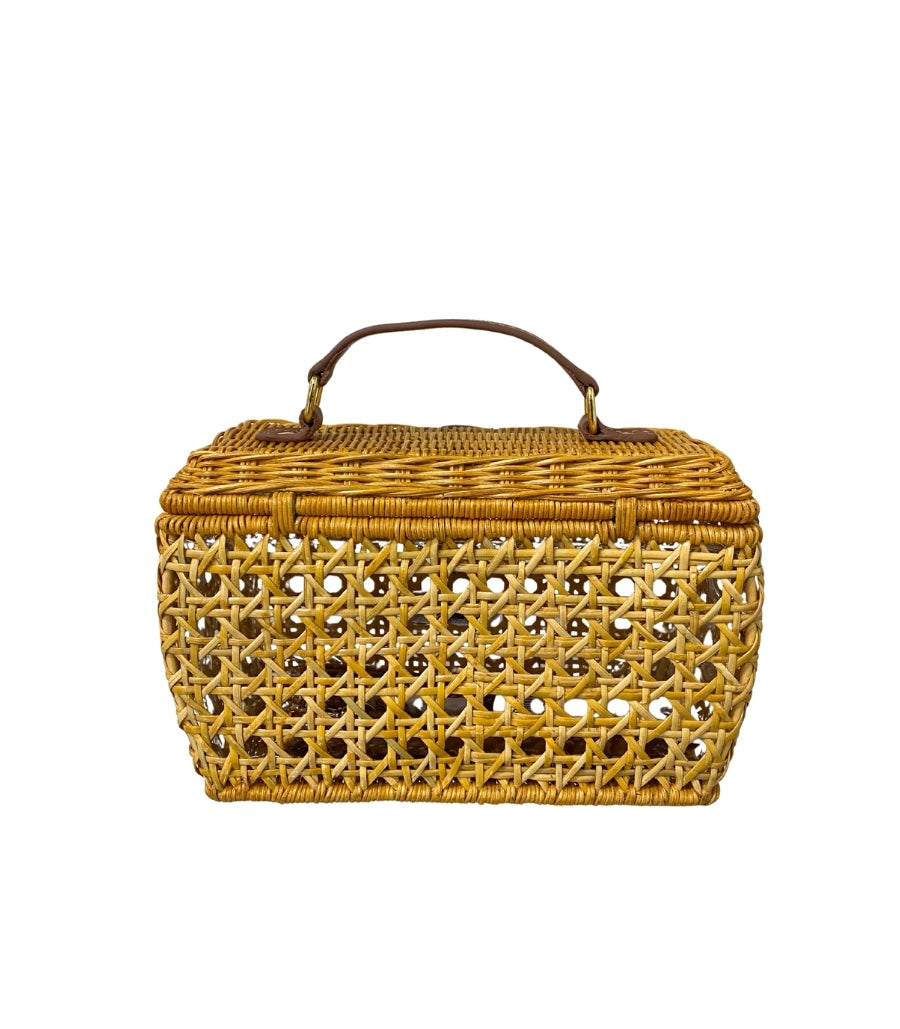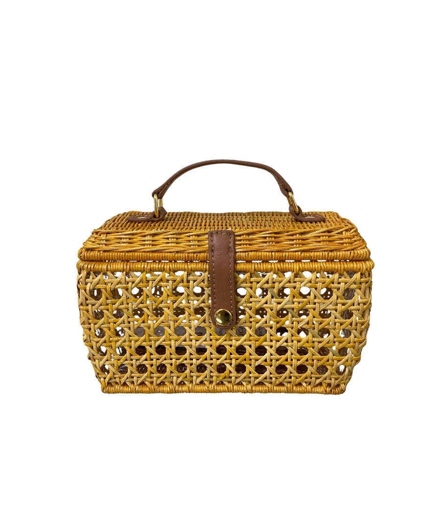 Cathy Light Honey, em vime natural e trançado. Fechamento por aba com detalhe em couro caramelo e botão metálico. Alça de mão em couro, reforçada por fivelas com acabamento artesanal.