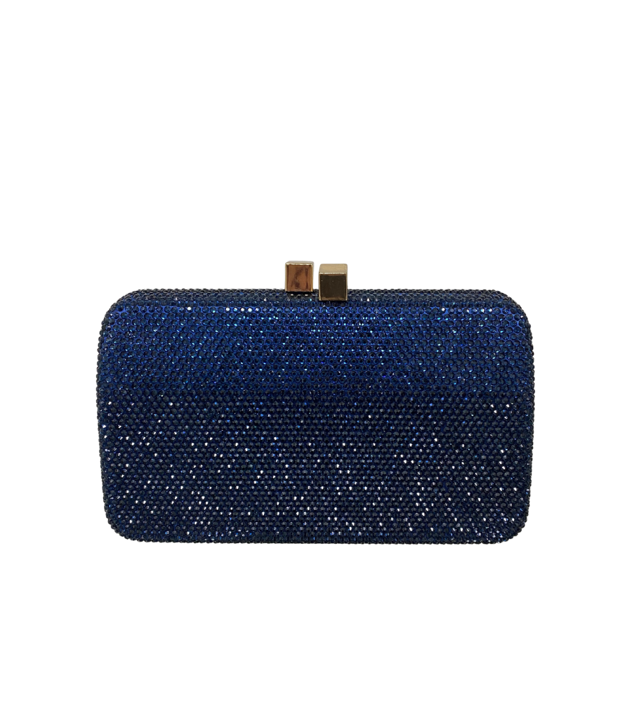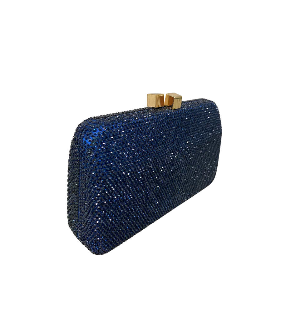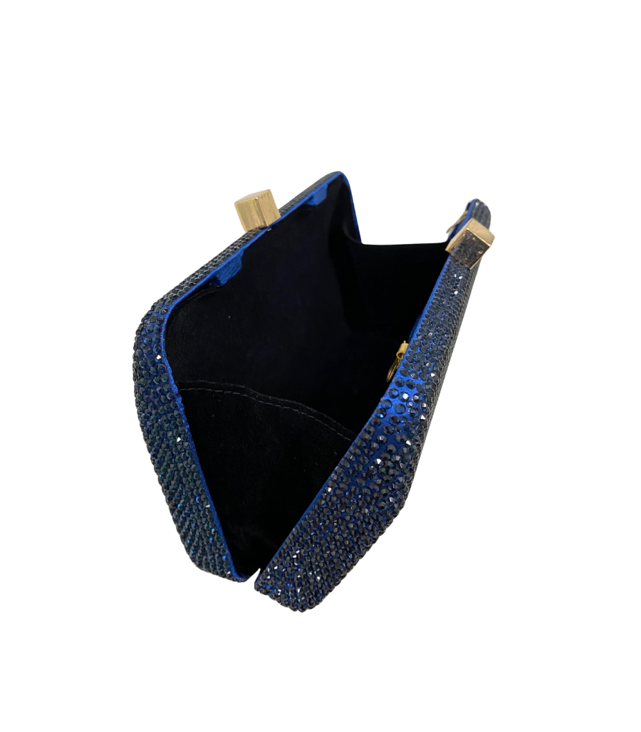 Clutch Celine Montana de tecido com brilho azul marinho. Forro em algodão. Fechamento magnético por encaixe. Acompanha duas alças removíveis: uma de corrente de cristal e outra de metal.