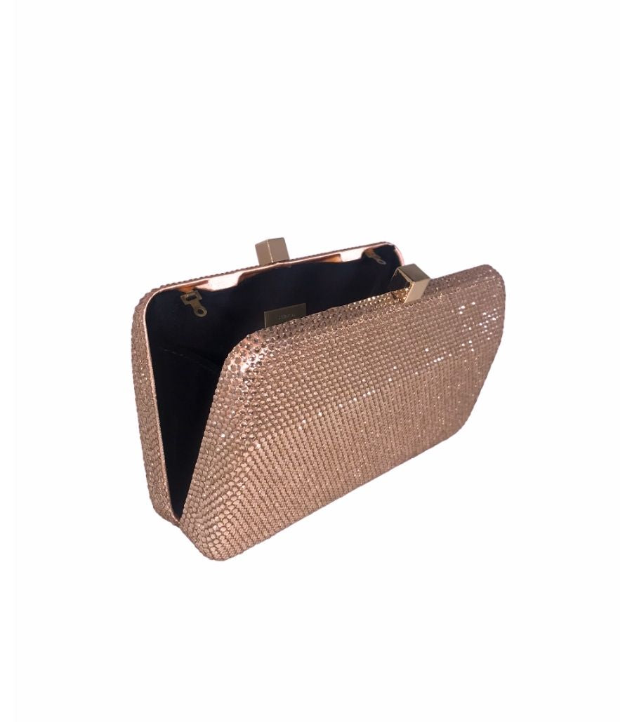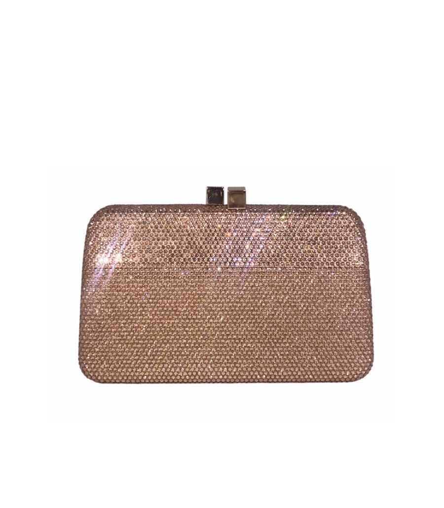 Clutch Celine Peach com aplicação de cristais rose. Forro em veludo. Fechamento magnético por encaixe com cristais aplicados. Acompanha duas alças removíveis: uma de corrente de metal e outra de cristais.