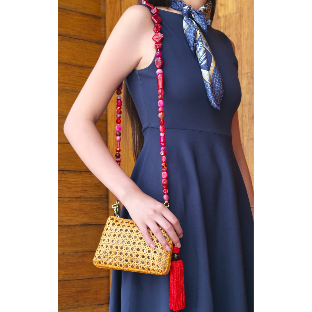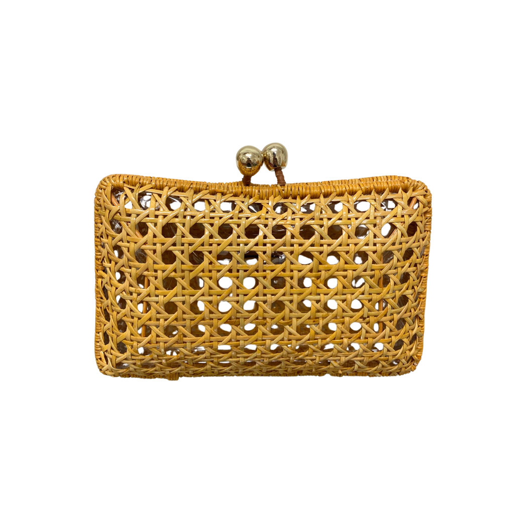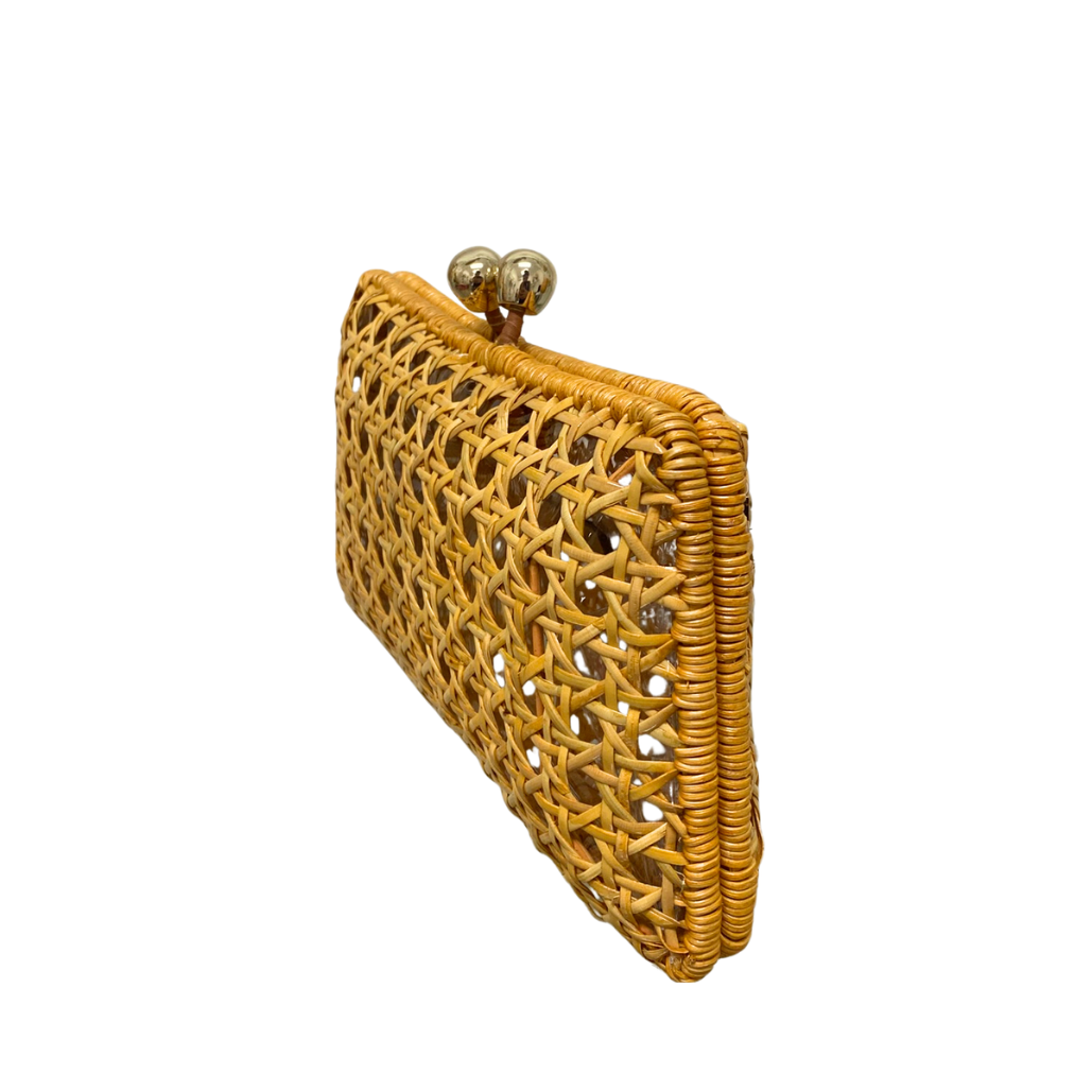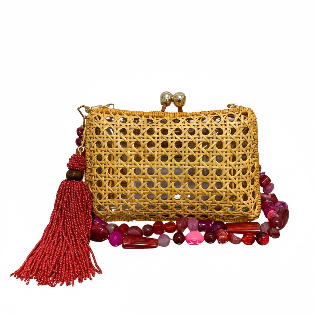Clutch Charlotte OM Light Honey de vime natural com trama aberta. Forro em vinil transparente. Fechamento magnético por encaixe. Acompanha duas alças removíveis: uma de pedras brasileiras e outra transversal de couro. Detalhe de tassel de miçangas.