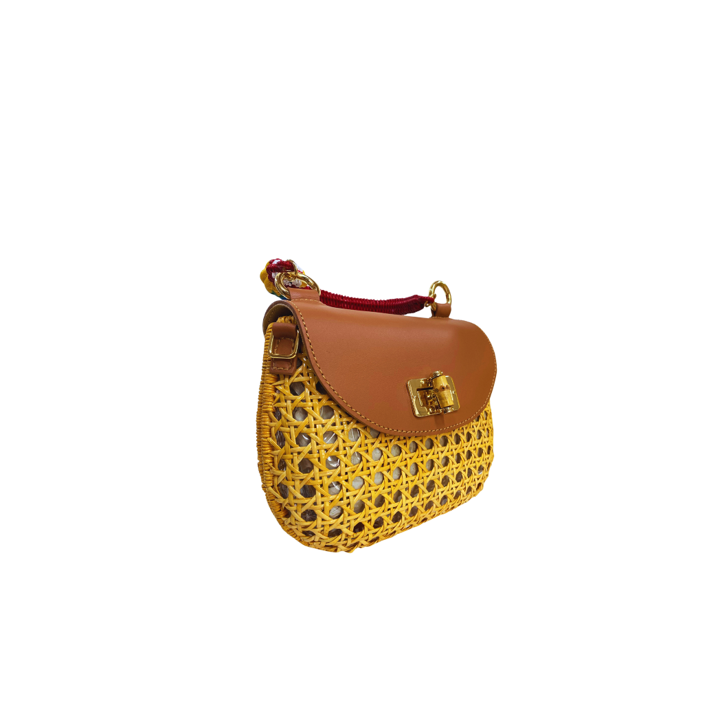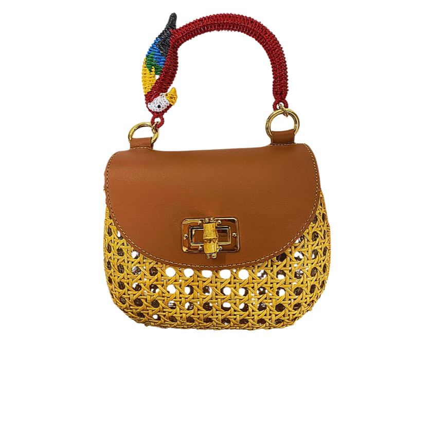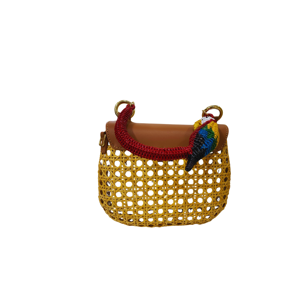 Bolsa Consuelo Macaw, em vime natural com trama aberta e detalhe de couro caramelo. Forro em vinil transparente. Fechamento magnético. Alça fixa em vime com detalhe de arara. Acompanha alça longa de couro.