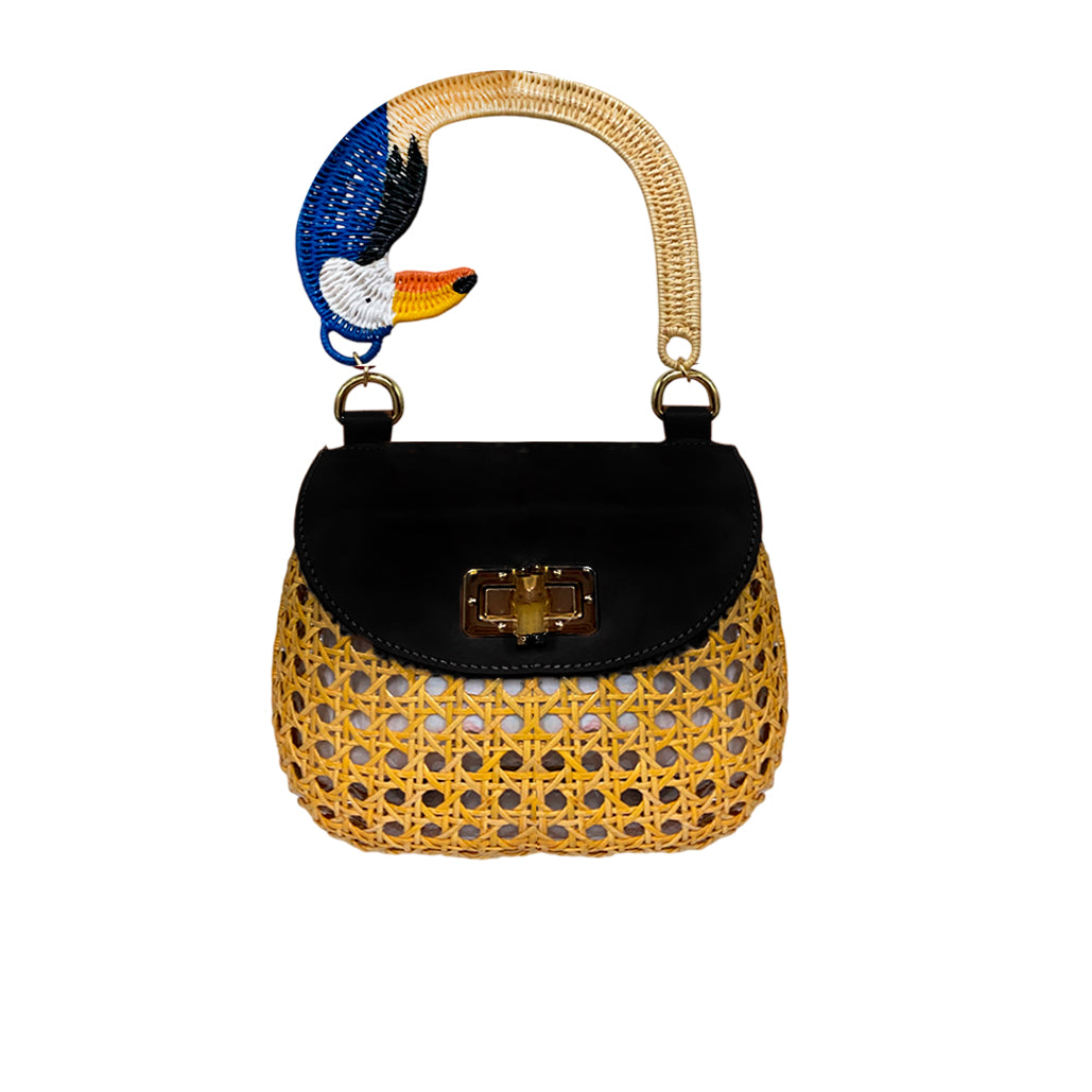 Bolsa Consuelo Toucan em vime natural com trama aberta e detalhe de couro preto. Forro em vinil transparente. Fechamento magnético. Alça fixa em vime com desenho de tucano. Acompanha alça longa de couro.