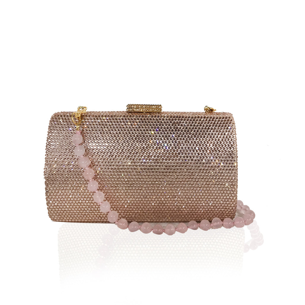 Bolsa retangular com aplicação de cristais rose. Forro em veludo. Fechamento magnético por encaixe com cristais aplicados. Acompanha duas alças removíveis: uma em corrente e outra de cristais.