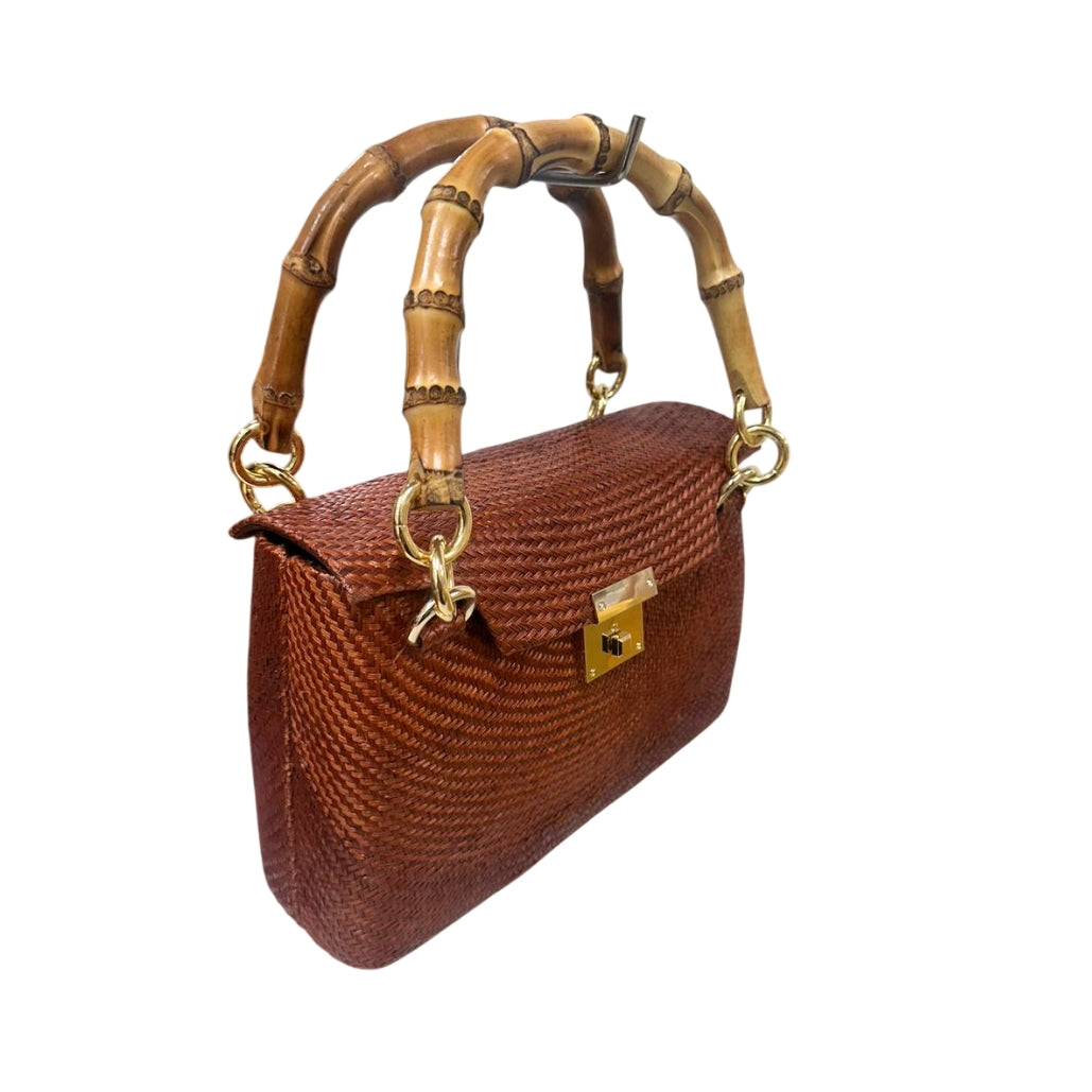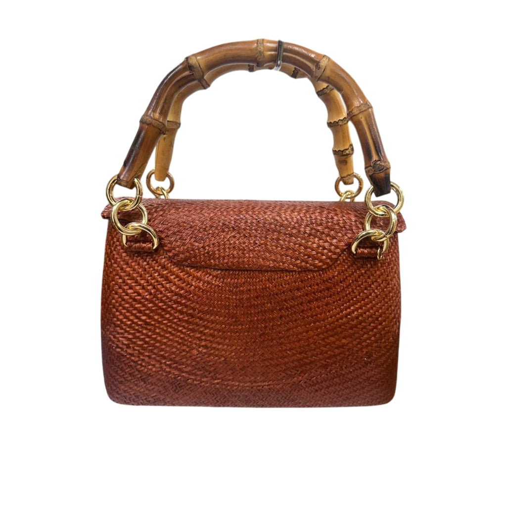 Bolsa Jeanne Caramel em vime natural com trama fechada e acabamento artesanal refinado. Possui alça superior em bambu, trazendo textura orgânica e um toque escultural ao design. Fecho frontal em metal com banho dourado, garantindo segurança e elegância. Detalhes metálicos complementam a construção da peça.