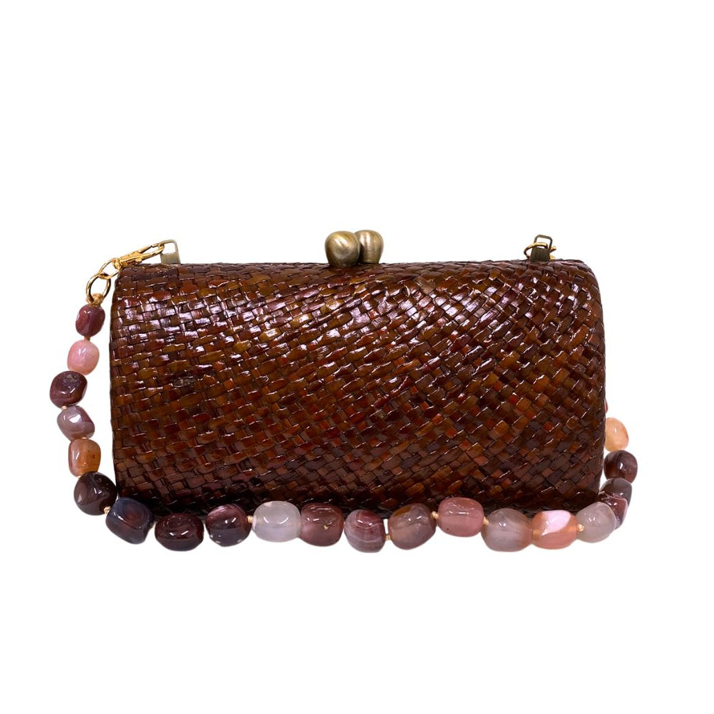 Bolsa clutch Liz brown estruturada em trama artesanal de palha em tom marrom, que revela brilho natural e textura. O fecho kiss-lock em metal envelhecido adiciona charme clássico. Acompanha duas alças removíveis: uma de pedras e outra de corrente de metal.