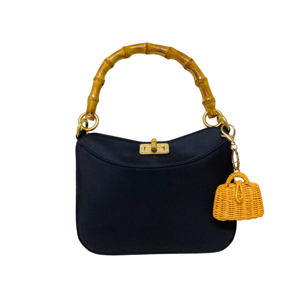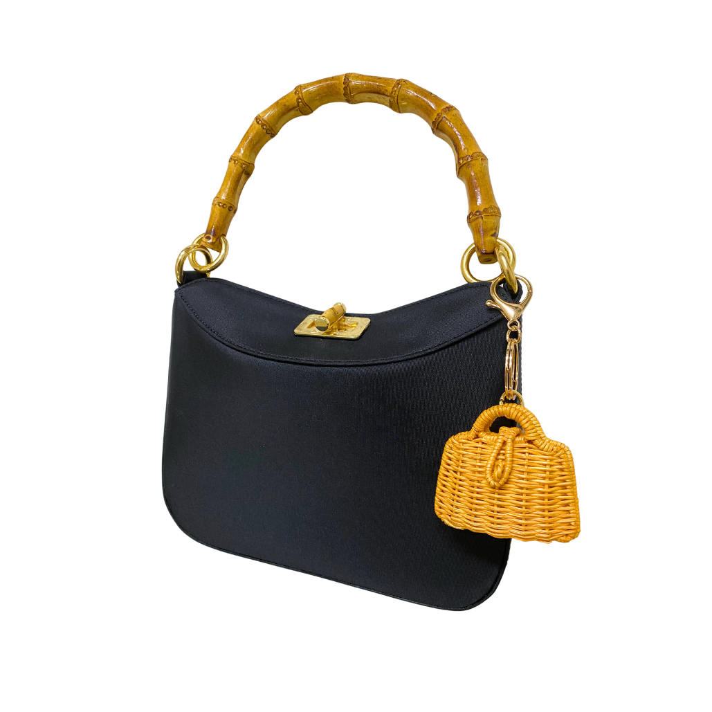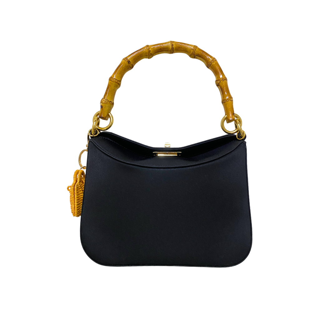 Bolsa Luana em nylon preto com fechamento com zíper. Alça de mão fixa em bambu e alça longa de metal. Acompanha chaveiro em vime.