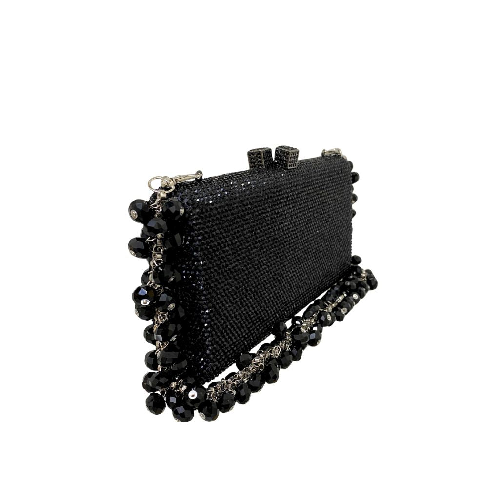 Clutch retangular Mariah Black com aplicações de cristais preto. Forro em veludo. Fechamento magnético por encaixe com cristais aplicados. Acompanha duas alças removíveis: uma transversal em corrente e outra de cristais.