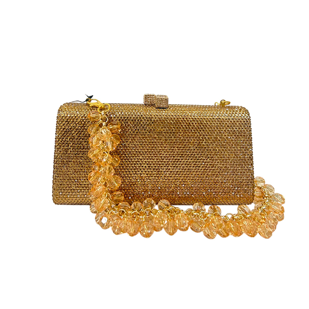 Clutch retangular Mariah Colorado com aplicações de cristais colorado. Forro em veludo. Fechamento magnético por encaixe com cristais aplicados. Acompanha duas alças removíveis: uma transversal em corrente e outra de cristais.