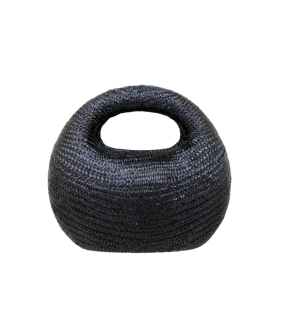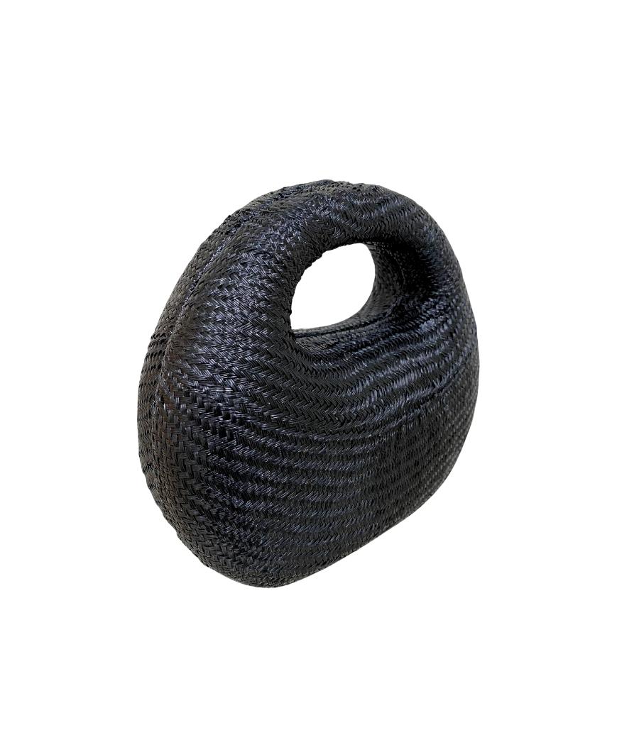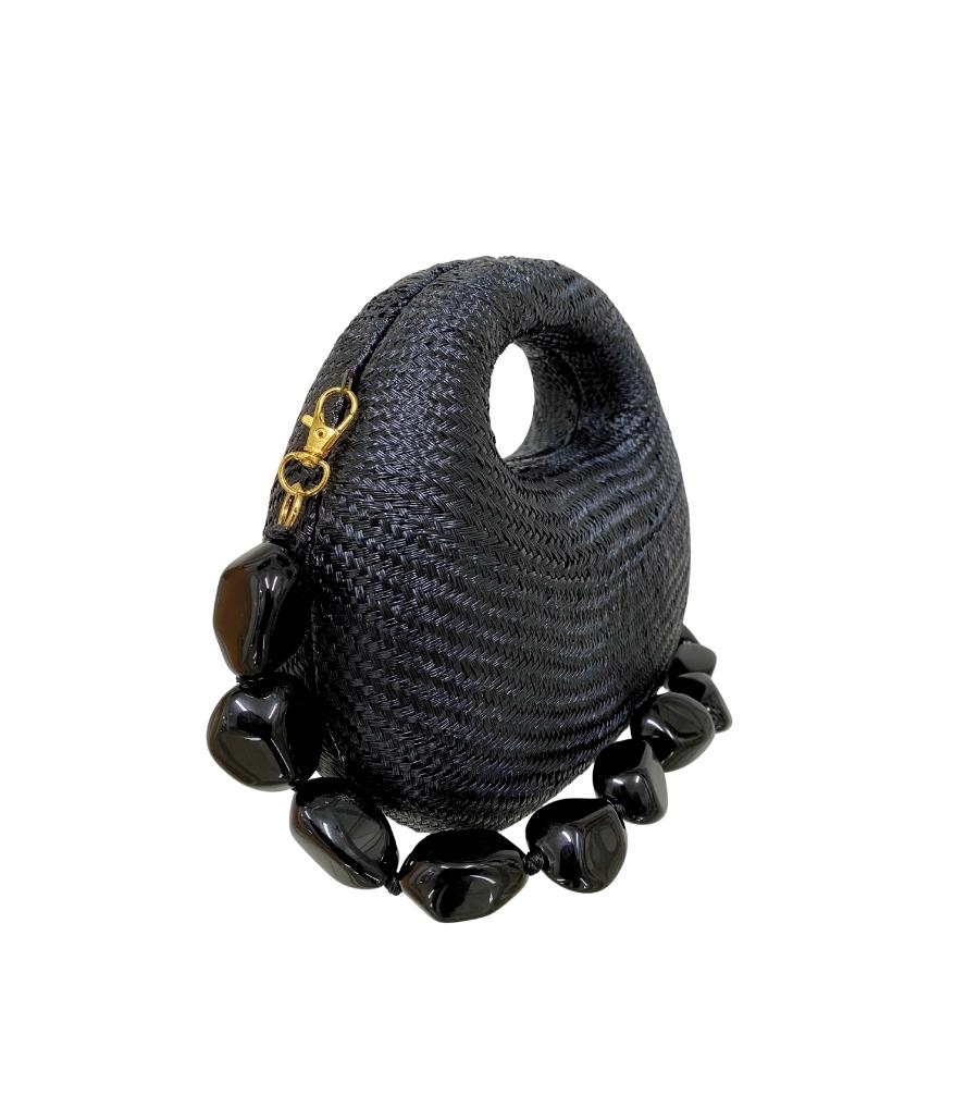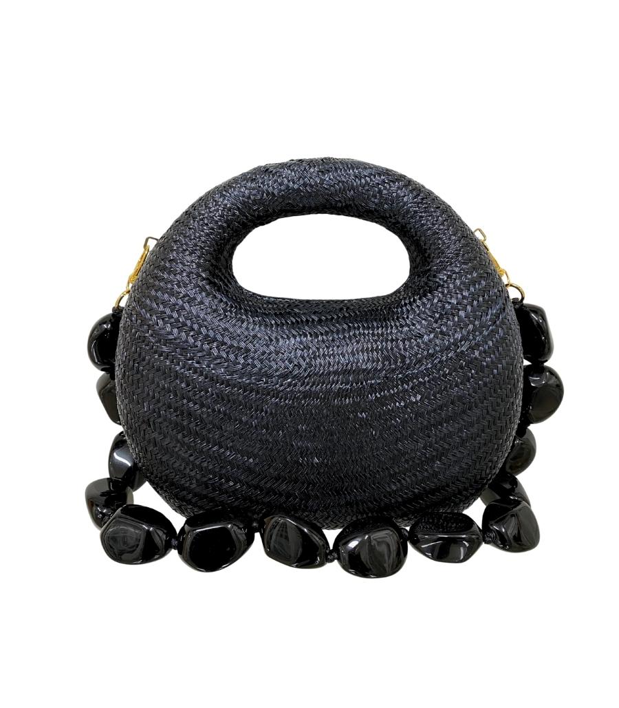 Bolsa Michelle Black estruturada de palha preta e formato arredondado. Forro em poliéster. Fechamento magnético. Acompanha uma alça removíveis de corrente de metal.