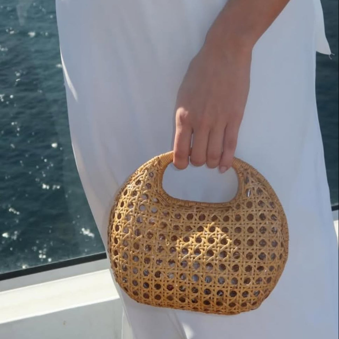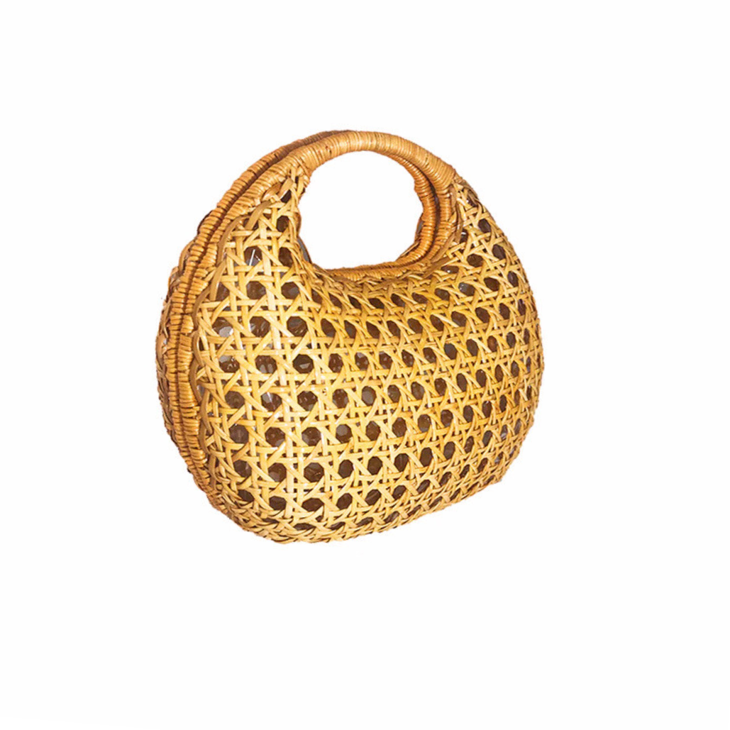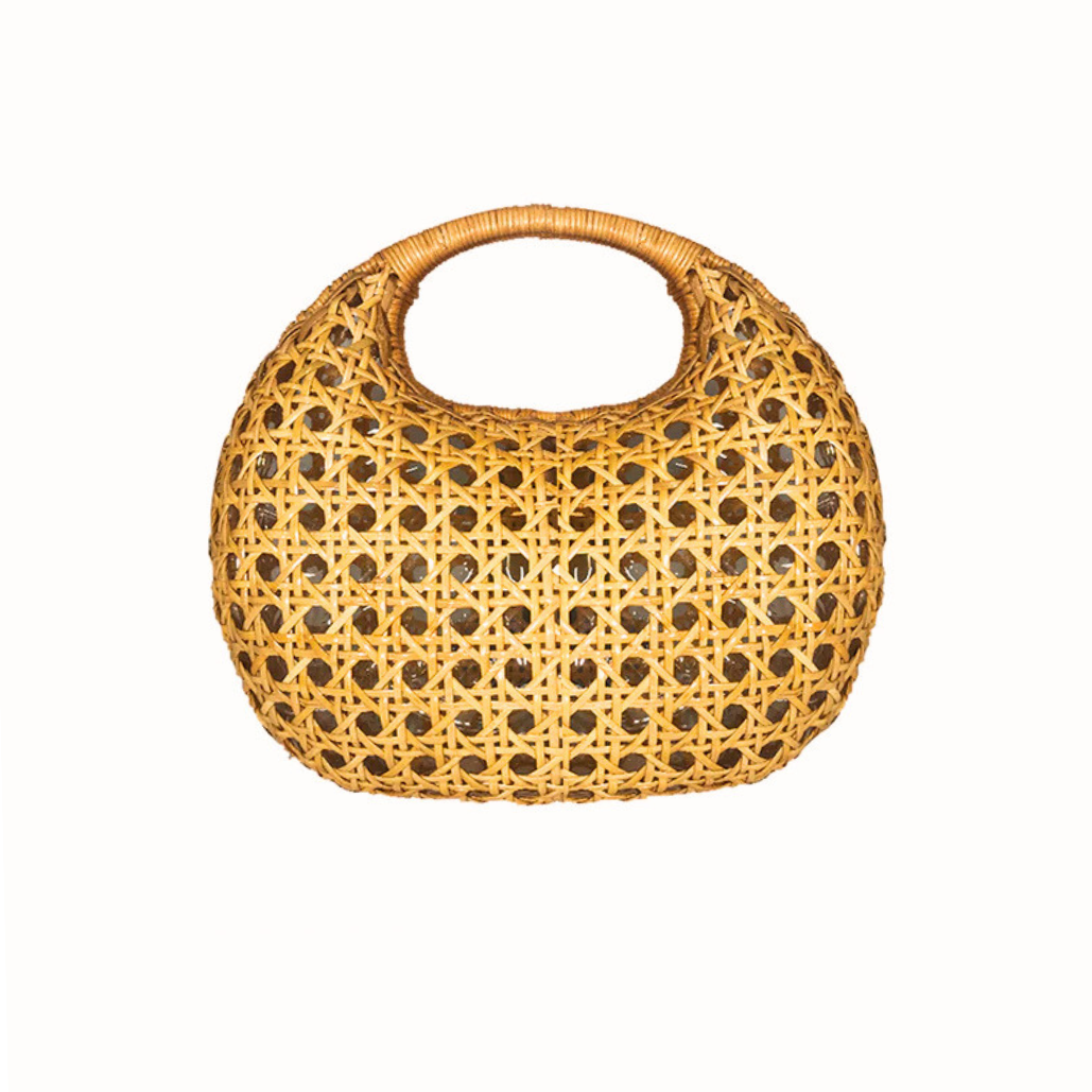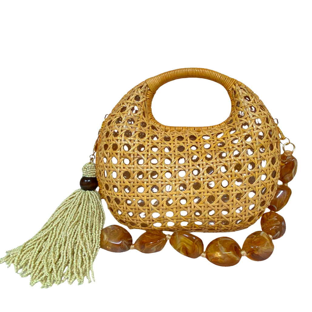 Bolsa Michelle Light Honey estruturada de vime natural com formato arredondado e trama aberta. Forro em poliéster. Fechamento magnético. Acompanha duas alças removíveis: uma de pedras e outra de couro caramelo.