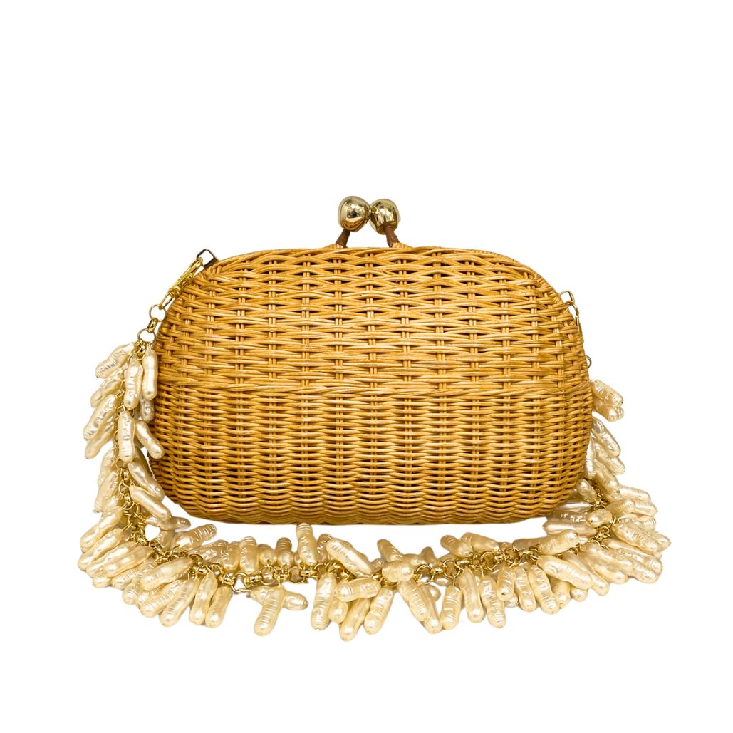 A Olivine Braid é tecida à mão, com trama fechada em vime em tom natural cria uma superfície harmônica e luminosa, enquanto o formato estruturado mantém a elegância atemporal. Acompanhada de uma alça de couro e outra de perola.