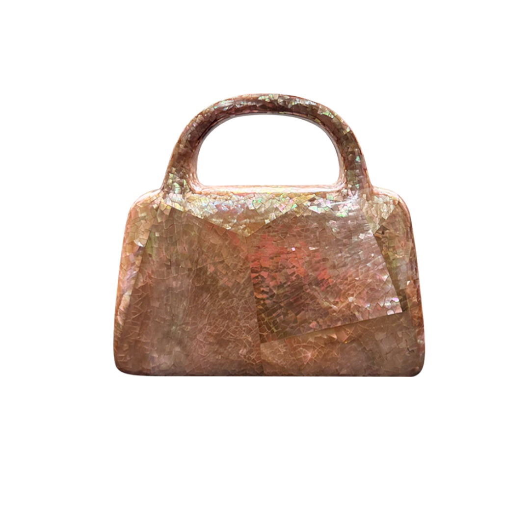 Bolsa Pandora em madrepérola marrom furtacor. Forro em veludo. Fechamento magnético com encaixe. Design estruturado.