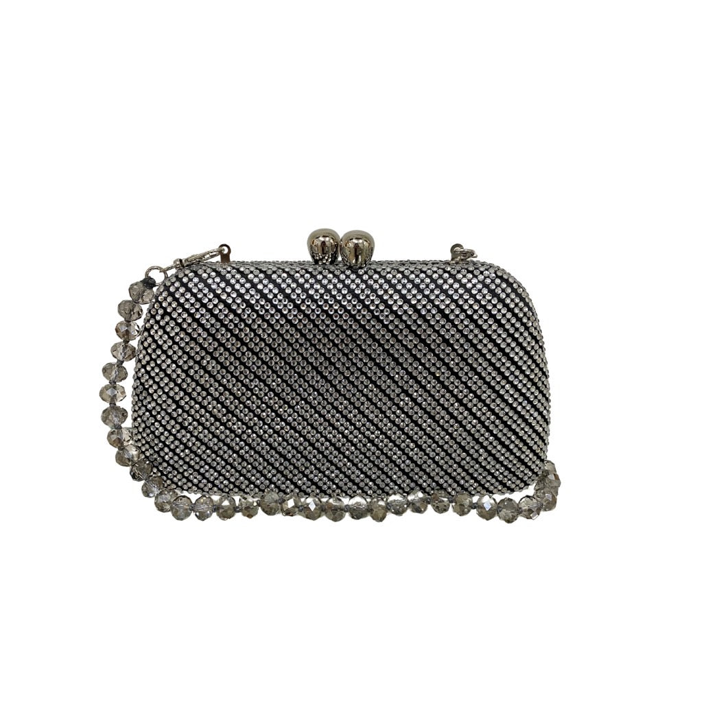 Clutch Penelope Crystal com aplicação de cristais prata e fundo em cetim preto. Forro em veludo. Fechamento magnético por encaixe em metal prata. Acompanha duas alças removíveis: uma em corrente e outra de cristais.