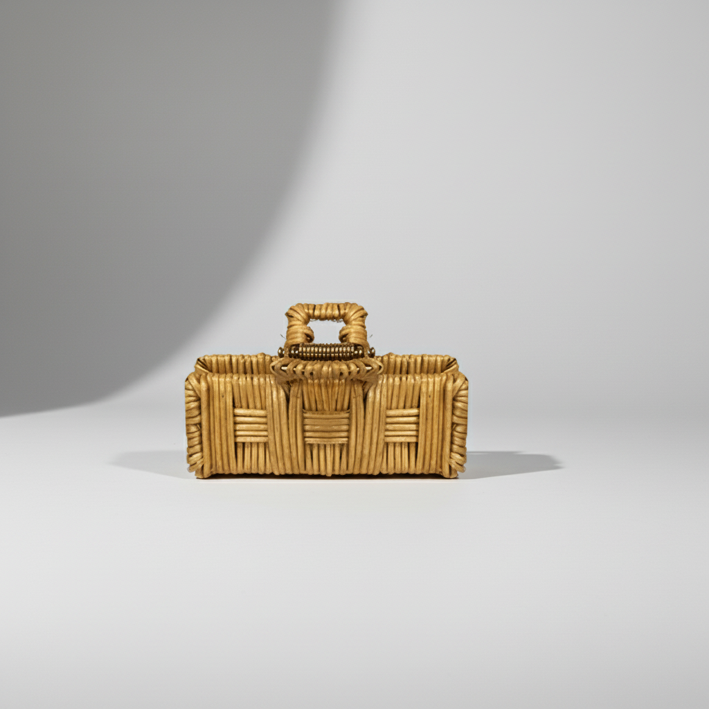Presilha em vime natural, formato retangular e tamanho médio e garra em metal dourado.