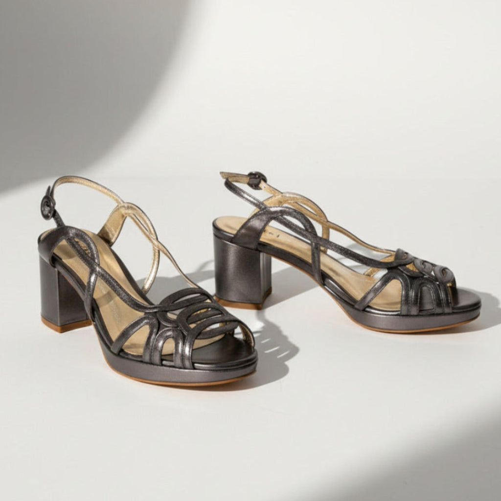 Sandália Mix Onix em couro metalizado grafite. Tiras frontais entrelaçadas e plataforma frontal. Salto alto grosso.