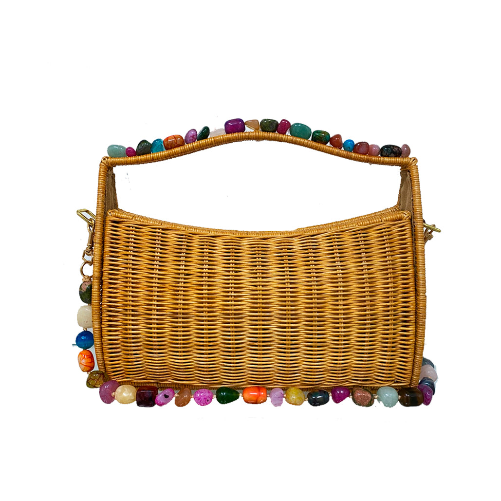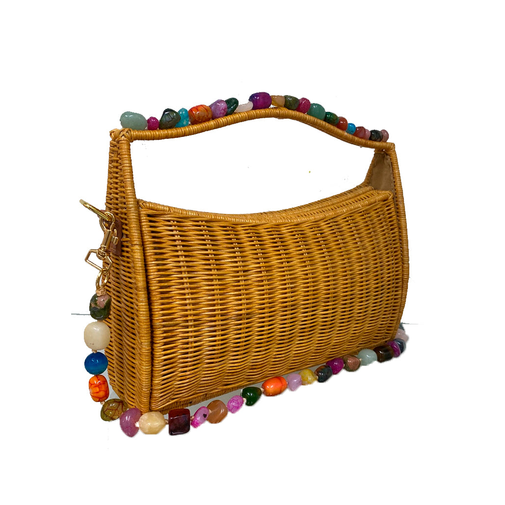 Bolsa Sarah em vime natural com trama fechada e alça de mão fixa em vime. Fechamento magnético e forro em poliéster. Possui alça de pedras e alça transversal removível em couro caramelo, permitindo diferentes formas de uso.