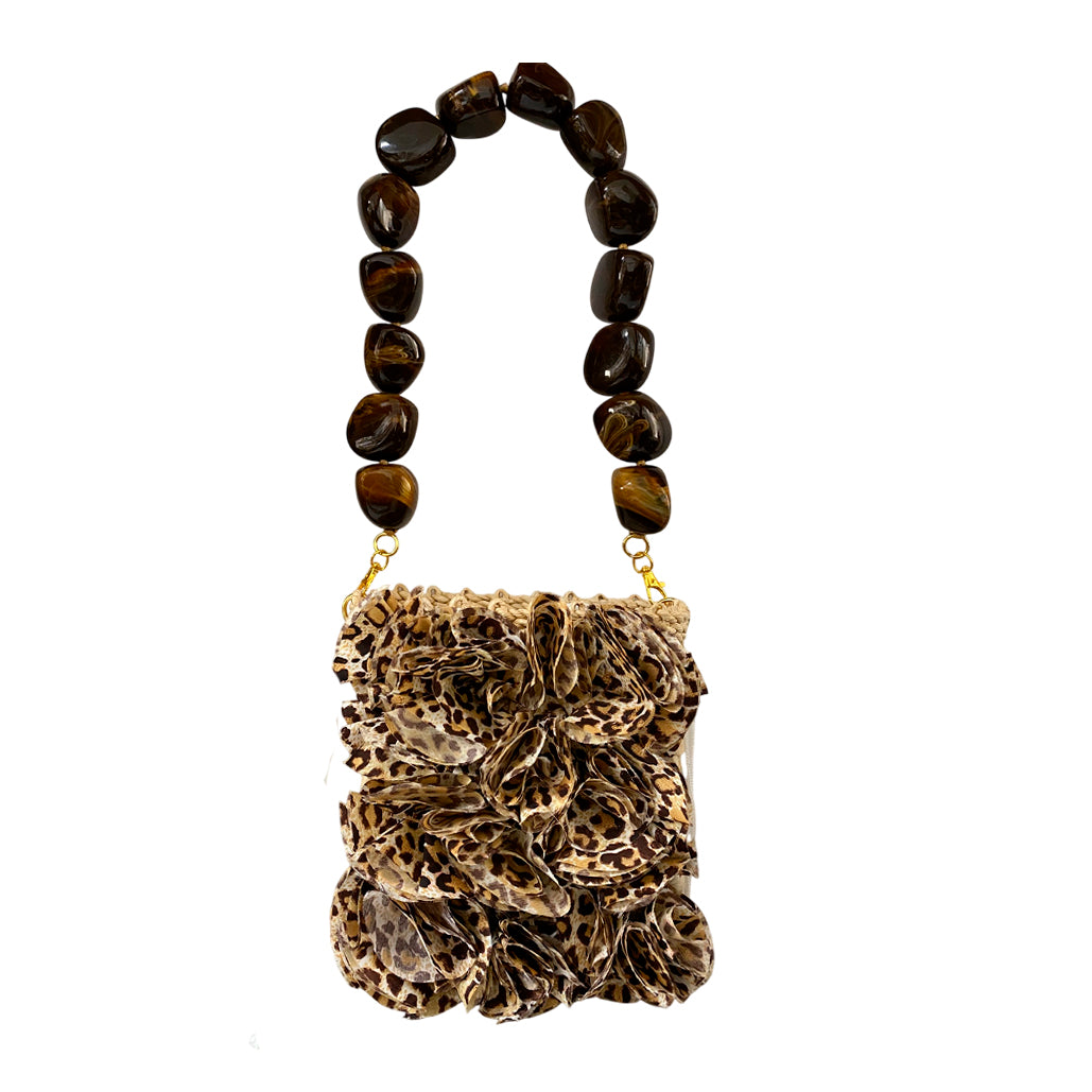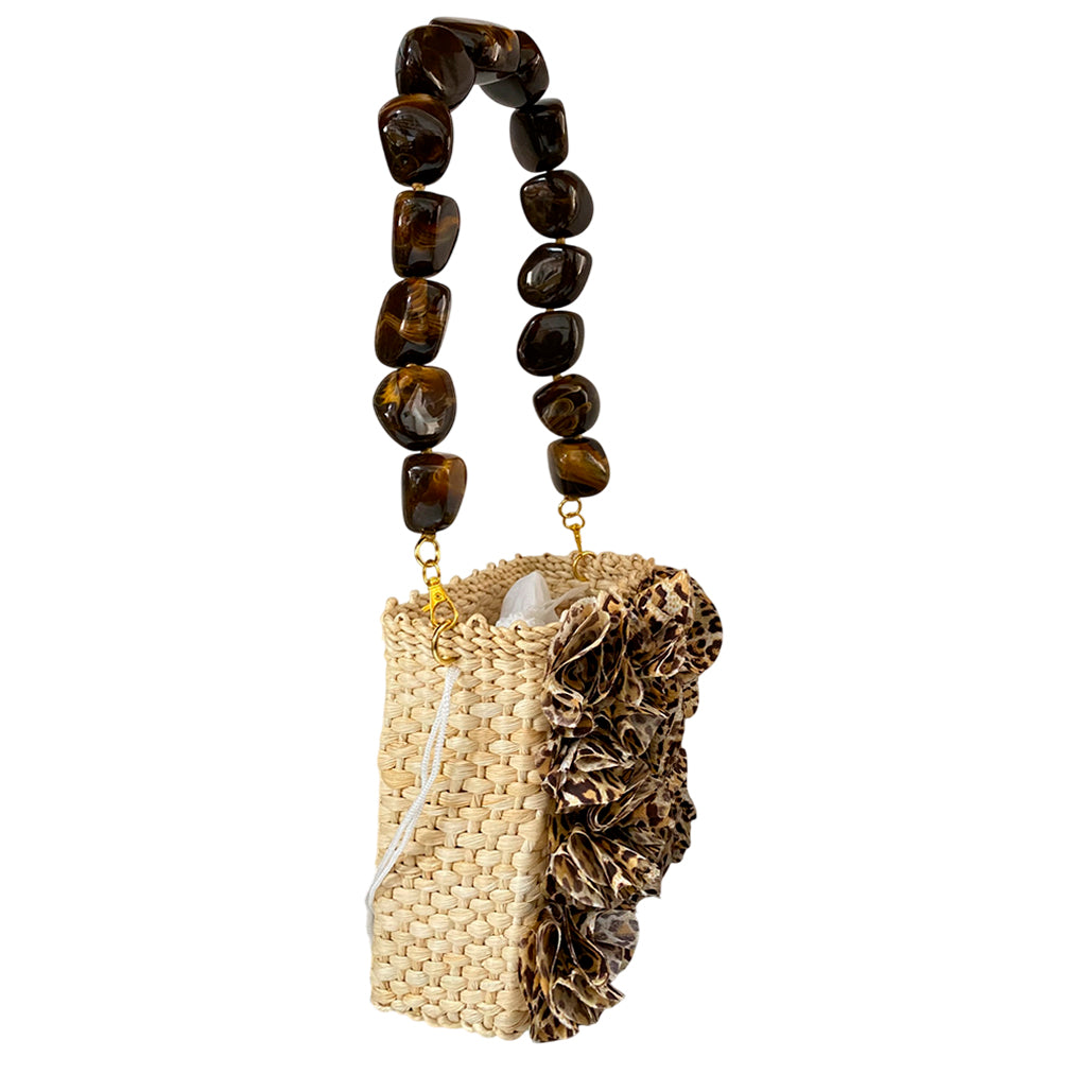 Bolsa Jenny em palha natural, com flores de tecido em animal print leopard e alça de mão em resina. Um toque fashion e artesanal para produções de verão.