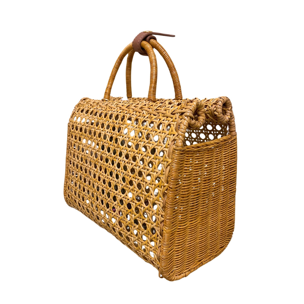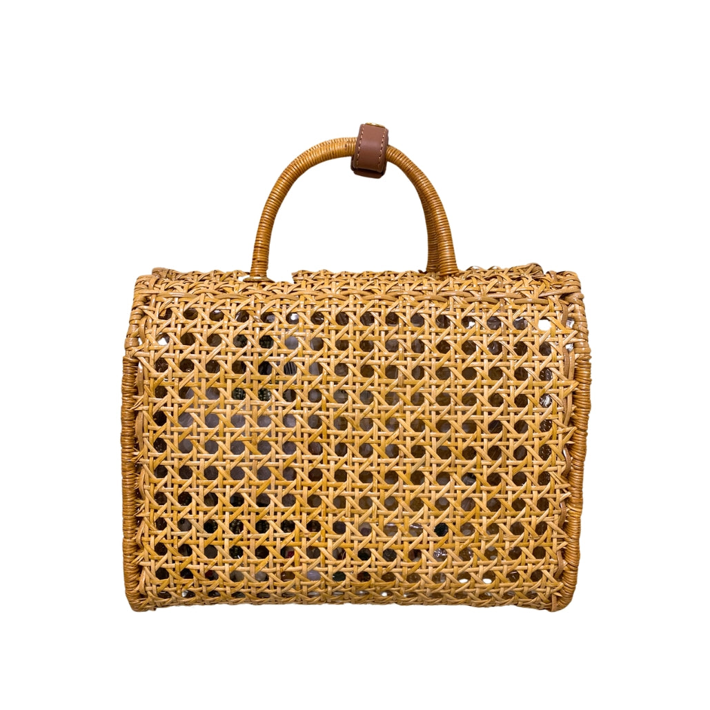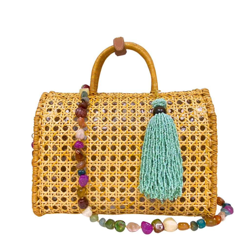 Bolsa Suzy Light Honey de vime natural com trama aberta e alça fixa de mão. Detalhe na lateral de palha. Forro em vinil transparente. Acompanha duas alças longas removíveis: uma de pedras brasileiras e outra de couro caramelo.