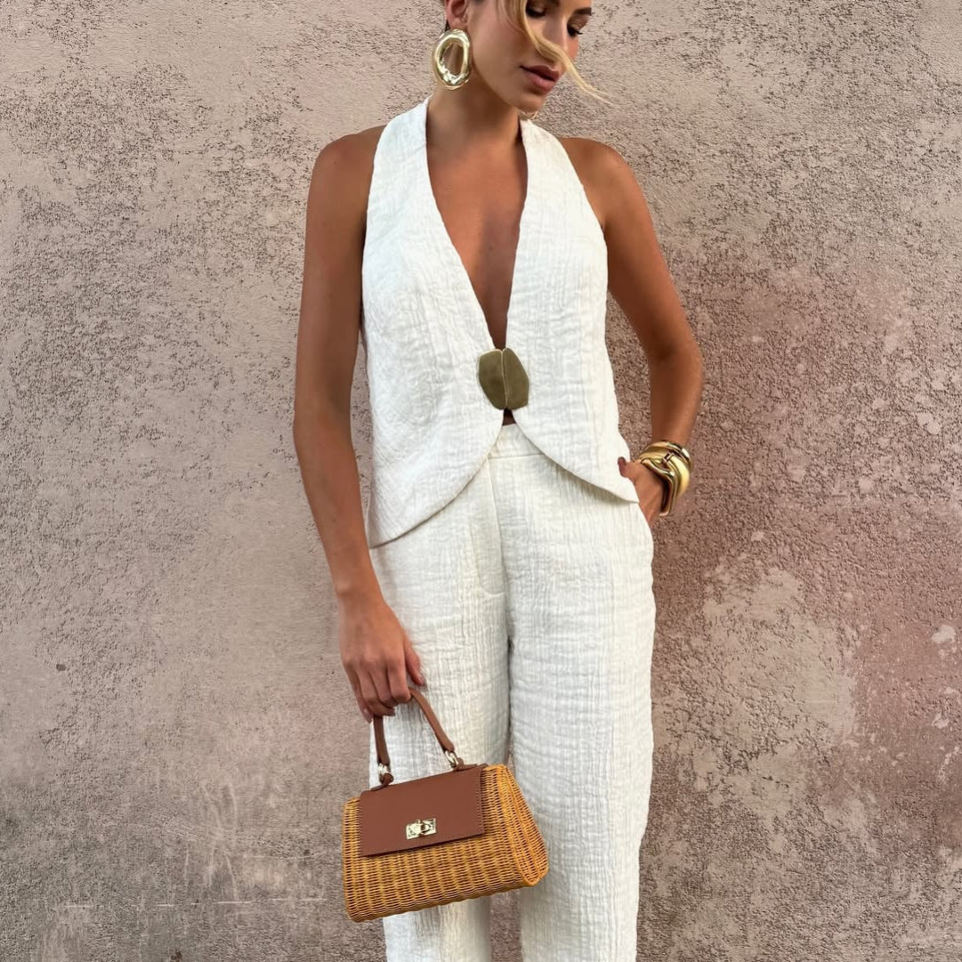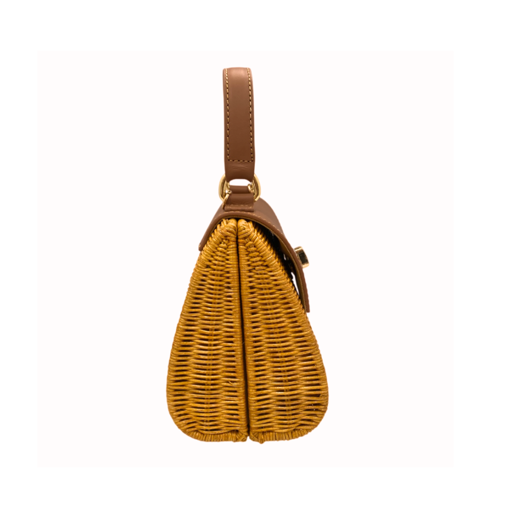 A Yasmin Light Honey é feita artesanalmente em vime natural, com tampa e alça de mão em couro na cor caramelo. Possui design estruturado, fecho metálico dourado e acabamento sofisticado. Acompanhada de uma alça de couro transversal.